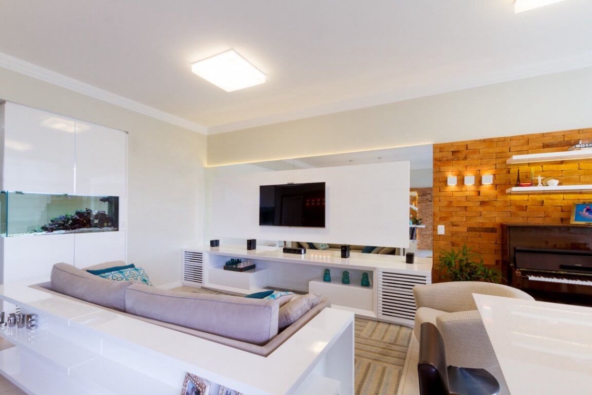 Neste apartamento localizado no bairro do Cacupé, o projeto de interiores da sala teve como principal base um lindo aquário da família. Demos destaque a ele, posicionando-o em uma parede divisória de ambientes que permitia que ele impactasse a chegada dos convidados.